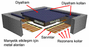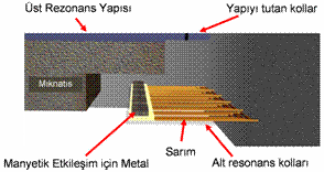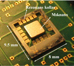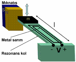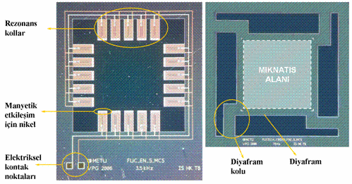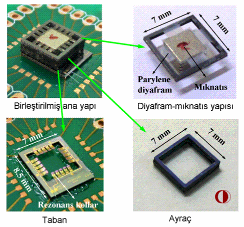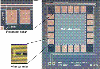 Ortadoğu Teknik Üniversitesi, Elektrik ve Elektronik Mühendisliği bünyesindeki MEMS grubunda bu amaçla üretilen ve test edilen mikro işlenmiş yapılardan biri Şekil 4’te gösterilmektedir. Bu yapıda, üzerinde bir saç telinin 10’da 1’i (10 µm) genişliğinde ve 1000’de 1’i (100 nm) kalınlığında altın metal sarımlar olan, yaklaşık 15 µm kalınlığında rezonans kollar bulunmaktadır. Rezonans kolların ortasındaki bölgeye ise bir mıknatıs yerleştirilmiştir. Ortamda varolan titreşimler, bu yapı üzerinde bulunan rezonans kolları harekete geçirmekte ve metal sarımlar mıknatısa karşı titreşmektedir. Sonuç olarak elektromanyetik indükleme yöntemiyle elektriksel enerji açığa çıkmaktadır. Üretilen bu enerji, ihtiyaç duyulduğunda kullanılmak üzere, bir kapasitör üzerinde depolanabilir. Ayrıca yapının, boyutları (8x9.5x0.5 mm) ve ağırlığı (200 mg) göz önüne alındığında, özellikle mikro algılayıcılar, kablosuz iletişim ve çevresel gözlem gibi bir çok sistem için uygun olduğu görülmektedir. Bu sayede tamamen kendine yetebilen ve dışarıdan hiçbir müdahale olmaksızın çalışabilen sistemleri geliştirmek mümkün olacaktır. Sunulan bu yöntemdeki temel sorun, elde edilen enerjinin çevresel sarsıntı frekansına bağımlı olması ve özellikle 1-10Hz arasında güç üretiminin nanowatt seviyesinde olmasıdır. Ancak bu frekans aralığı çevresel sarsıntının en yoğun olduğu aralıktır. Örnek olarak, algılayıcı sisteminin bir kol saatine yerleştirilmesi ve enerjisinin kol hareketlerinden kaynaklanan sarsıntıyla elde edilecek olması halinde literatürde sunulan yapılar bir çözüm olamamaktadır. ODTÜ MEMS grubunda geliştirilen ve üretilen bir başka enerji üreteci tasarımı da Şekil 5’te gösterilmiştir. Bu yapıda, “Frekans çevirim yöntemi” olarak isimlendirilen bir teknik kullanılarak, çevresel titreşim frekansı, çok daha yüksek frekanslı bir harekete dönüştürülmektedir. Bu sayede benzer enerji üreteçlerinin verimliliği önemli ölçüde artırılmıştır. Önerilen tasarım Şekil 6’da görüldüğü gibi iki alt parçadan oluşmaktadır.
